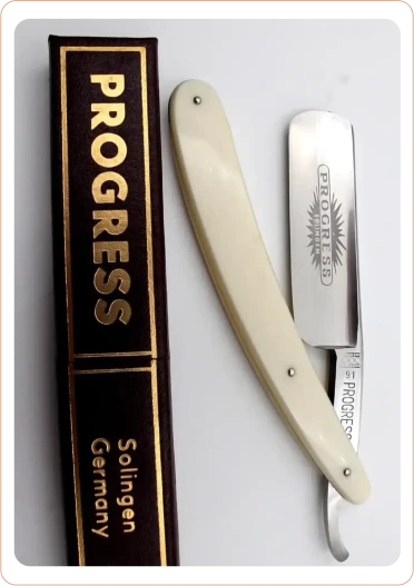 La "Progress" 28 es un verdadero tesoro de la barbería clásica, restaurado con una atención meticulosa a los detalles y actualizado con cachas modernas de resina roja transparente, directamente desde Solingen, Alemania, conocida por su excelencia en la fabricación de cuchillería.